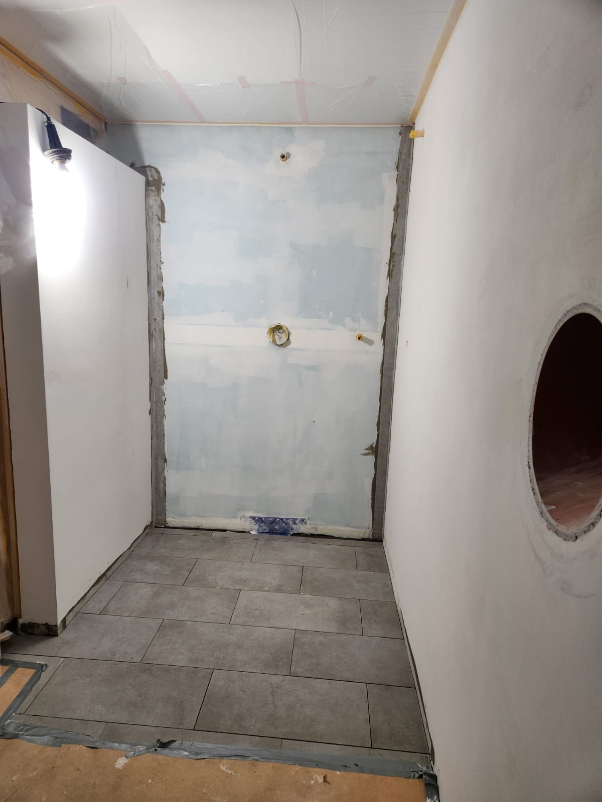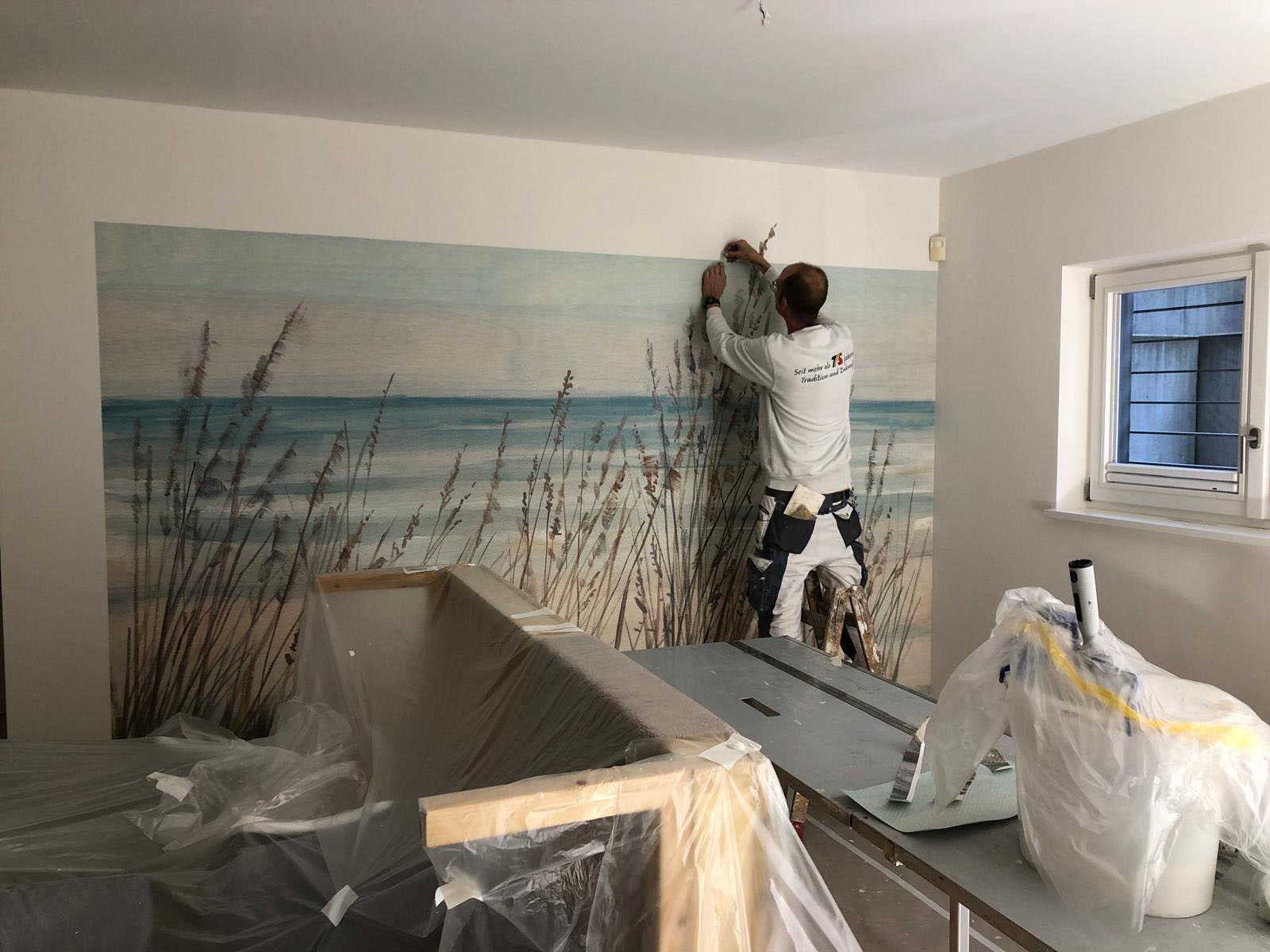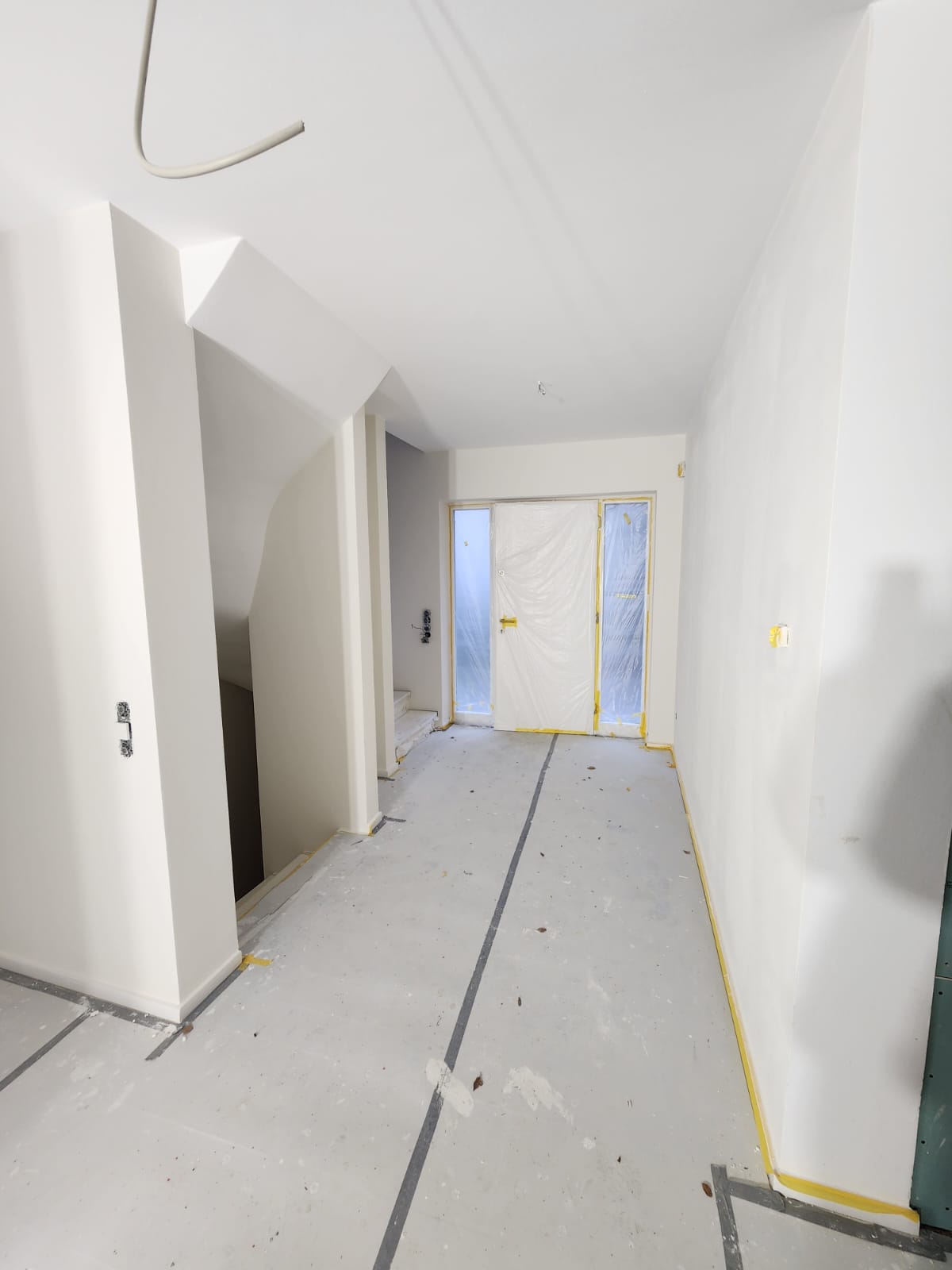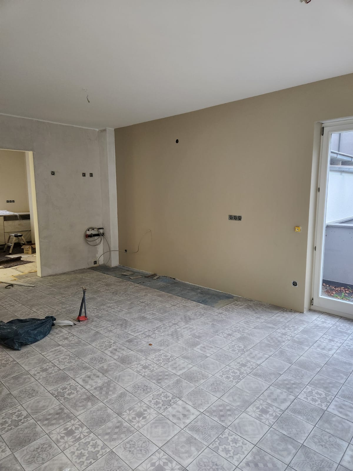 Anlegen der Kaminwand in Sichtbetonoptik Fertigstellung Wandgemälde Einliegerwohnung UG Malerarbeiten in allen Geschossen Montage der Sanitärobjekte erfolgt in der nächsten Woche