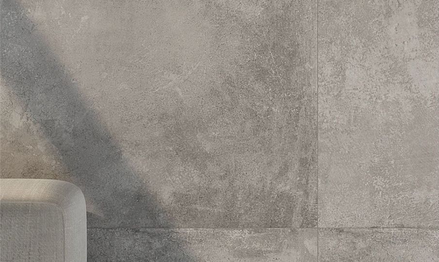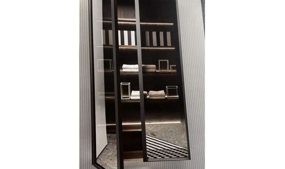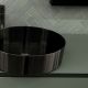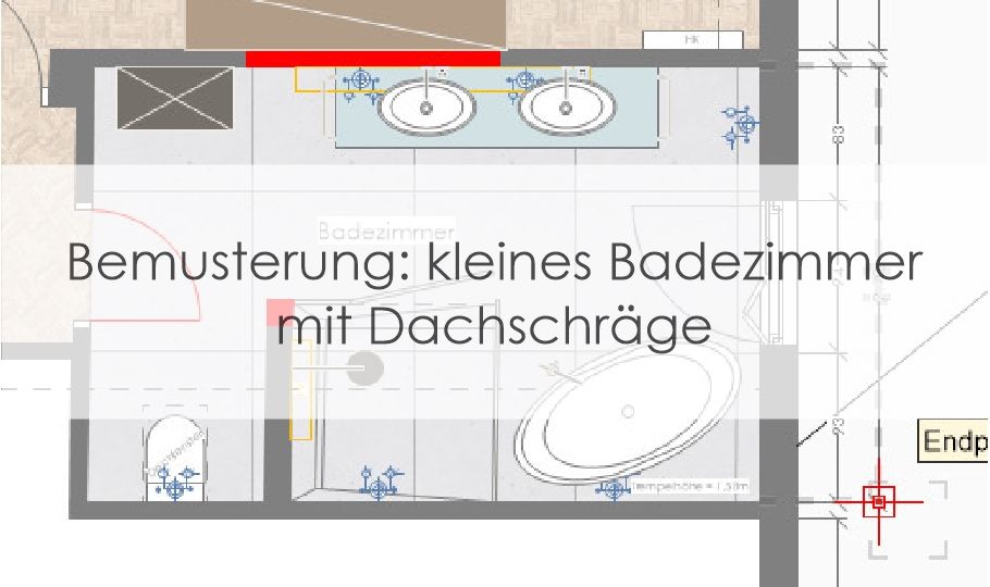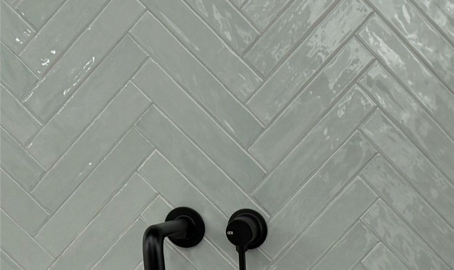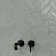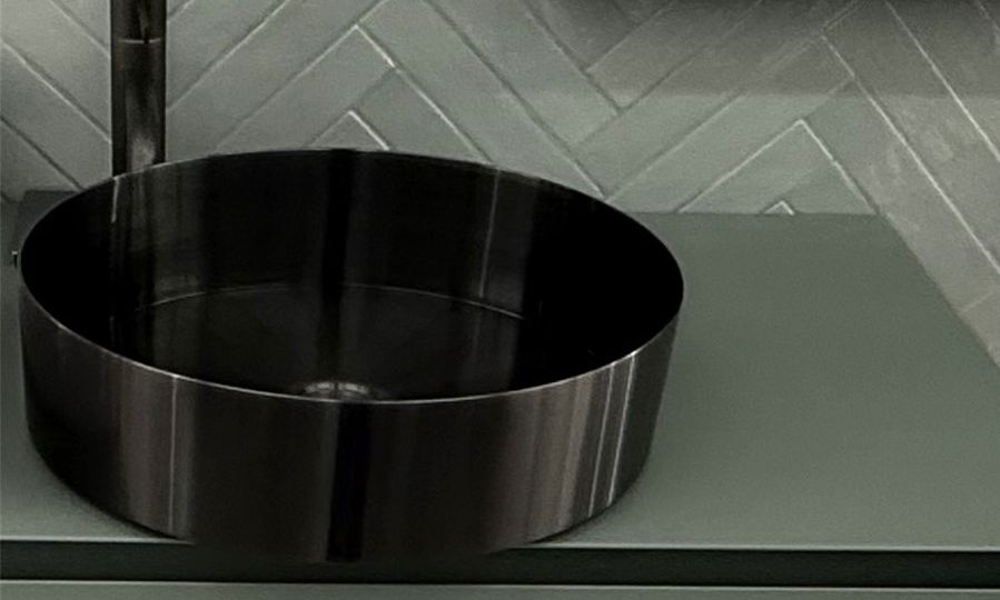 – Aufsatzwaschbecken in Edelstahl – Wandarmaturen, graphite gebürstet – Farbakzente in Salbei – Fischgrad Wandfliesen – Sichtbeton Großformatfliesen – Stauflächen Hängeschrank