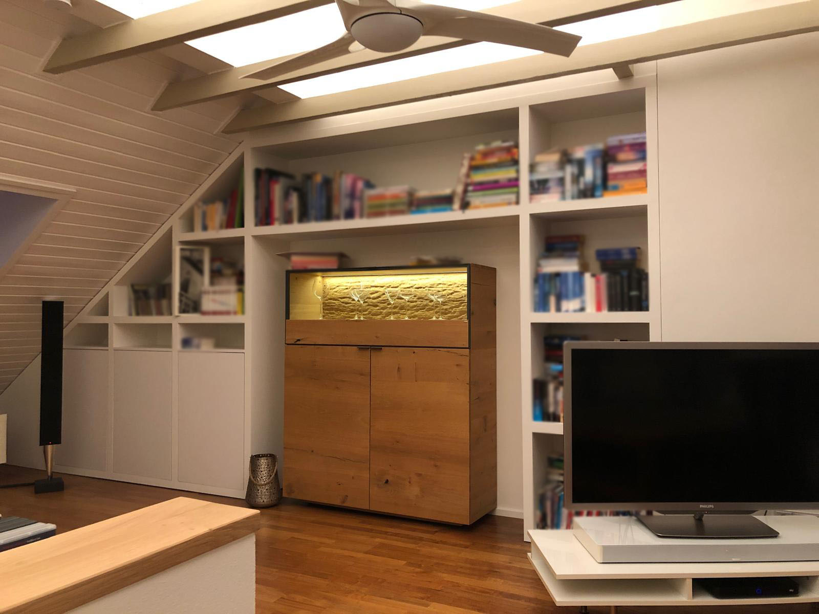 Die Aufgabe bei diesem Projekt bestand darin, die geringe Grundfläche optimal auszunutzen und dennoch ein offenes Raumgefühl zu schaffen. Durch den Einsatz von Loftschiebetüren mit Glaselementen zur Küche und zum Flur, entstand ein weitläufiger Gesamteindruck. Die ehemals offene Treppenharfe wurde zugunsten eines Einbauschranks in Trockenbauweise eingehaust. Ein besonderes Augenmerk lag bei diesem Projekt auf der Licht-und Audioplanung.